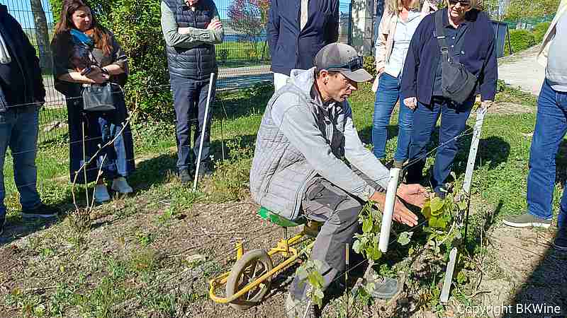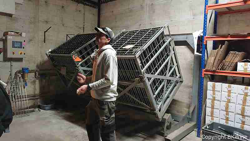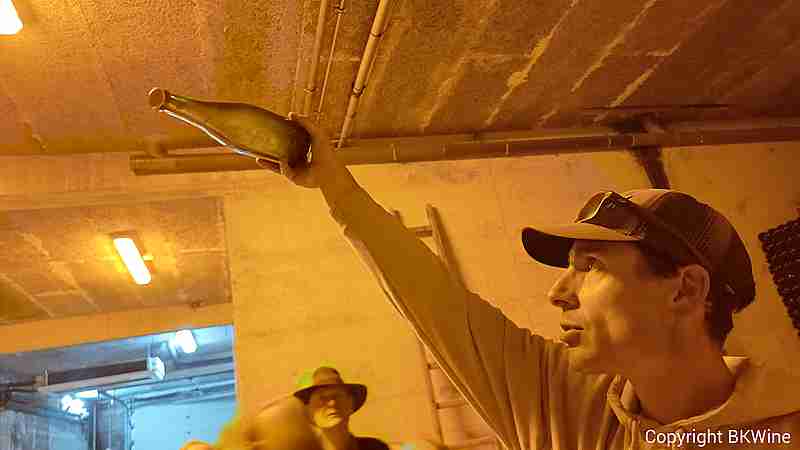 Champagne Rutat in Vertus in Côte des Blancs is managed by brothers Flavien and Baptiste. A visit here is always very informative. Flavien showed us the winter pruning – here they use the chablis pruning for chardonnay – the lees  in the bottle, the gyropalettes. We tasted the 2025 vin claire – the still wine before the second fermentation – from the oak barrel. Delicious!